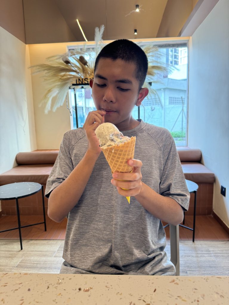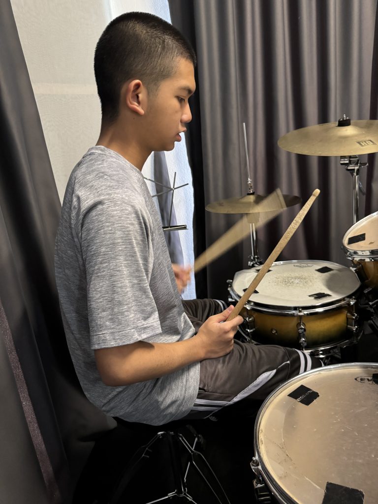 Later in the afternoon, brought him to his drum class with a new teacher – Aiman. This time round he was properly taught the concept of tempo alternating between bass and snare. Although sleep deprived, he managed to grasp the concept.